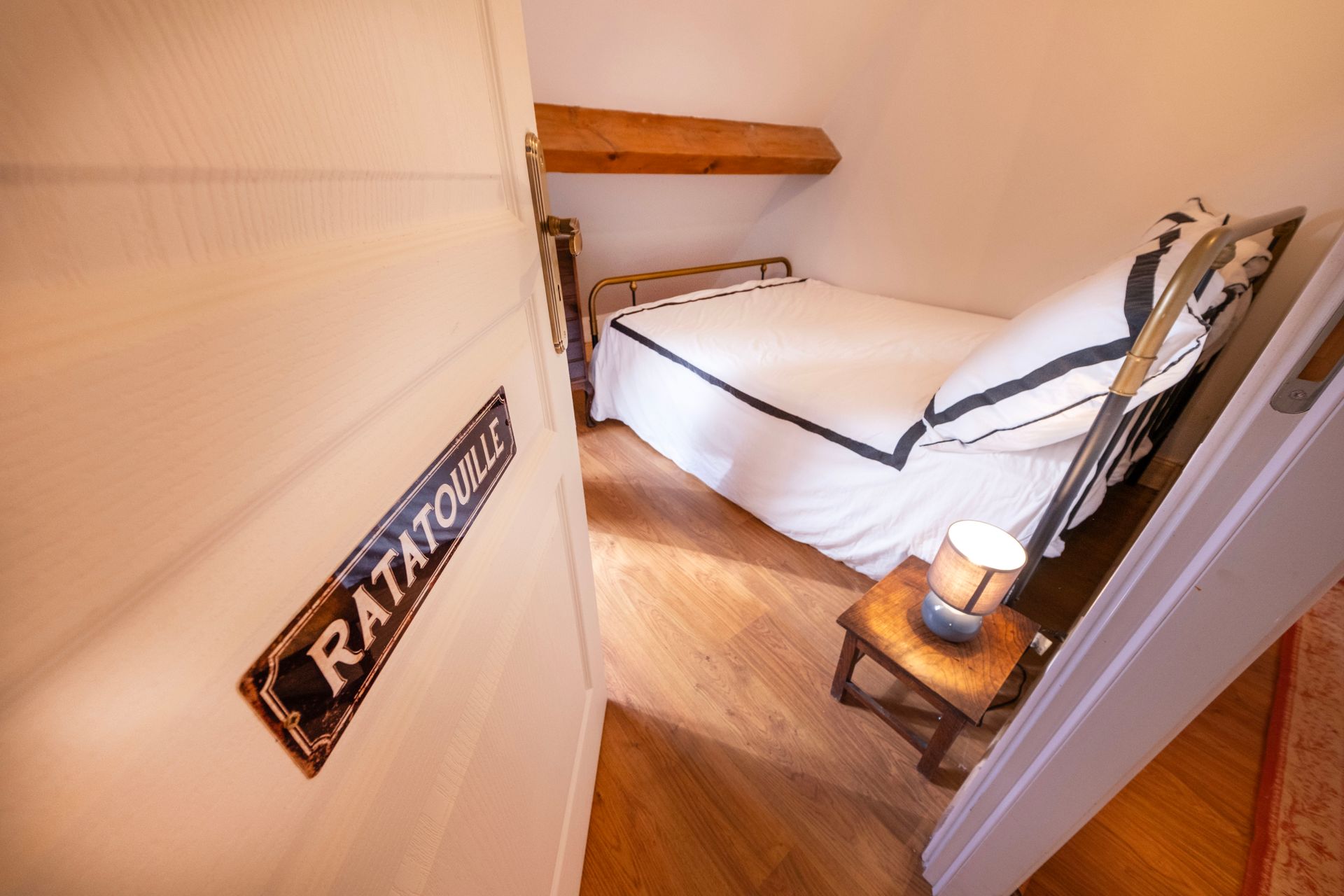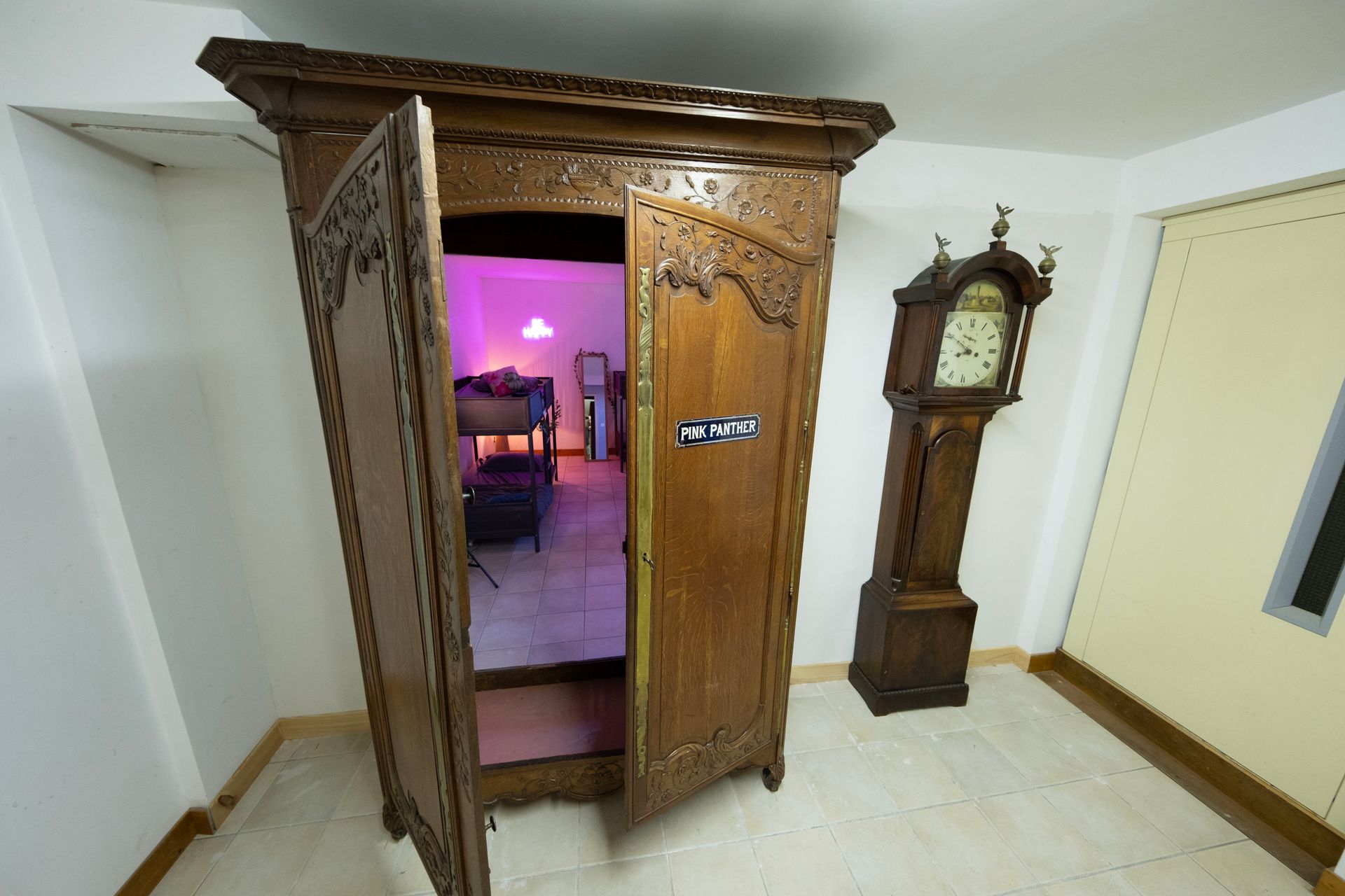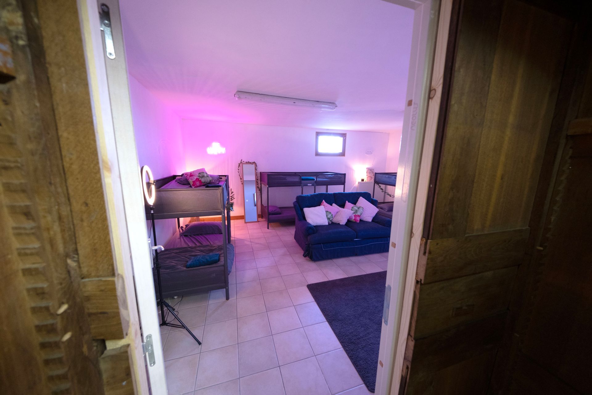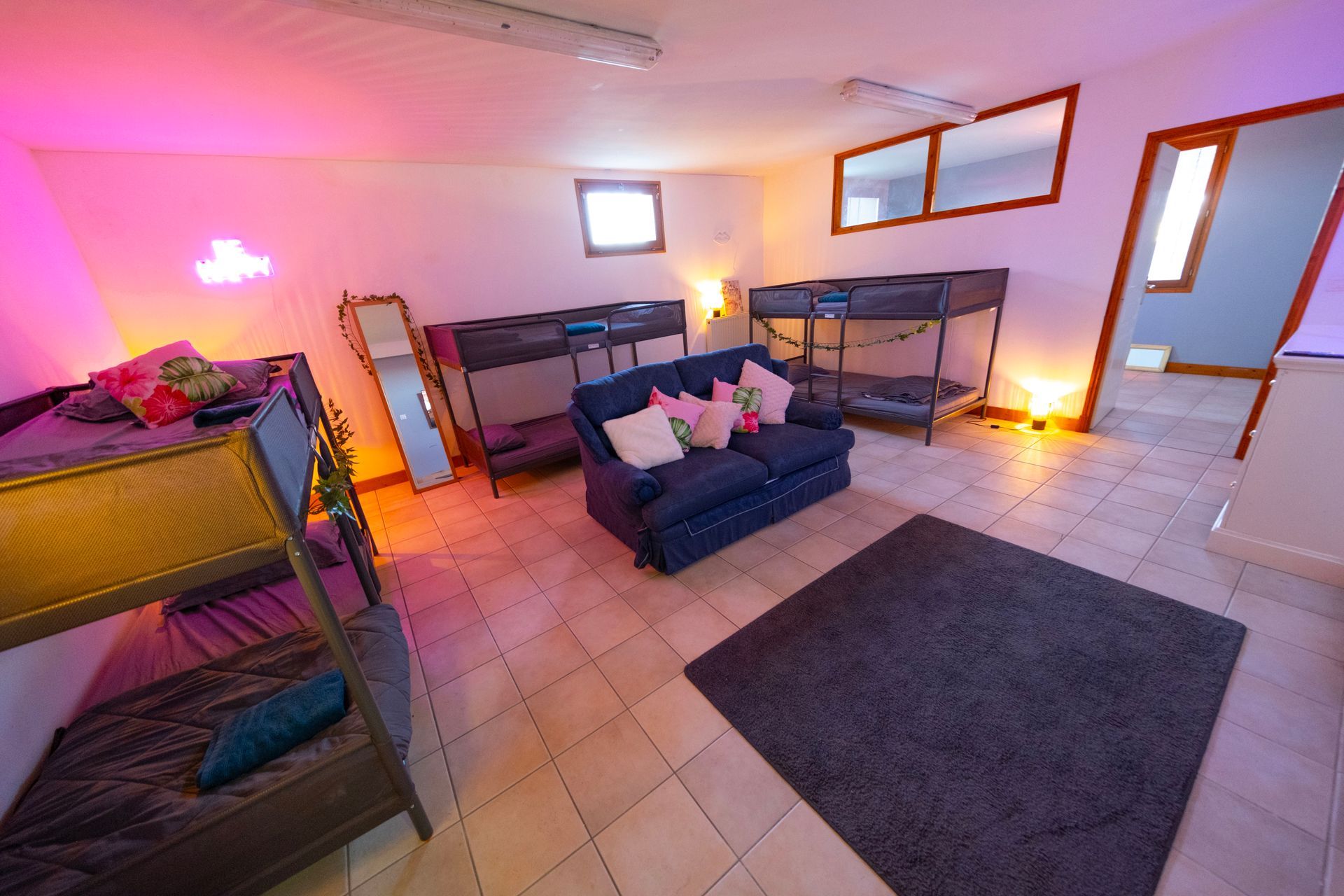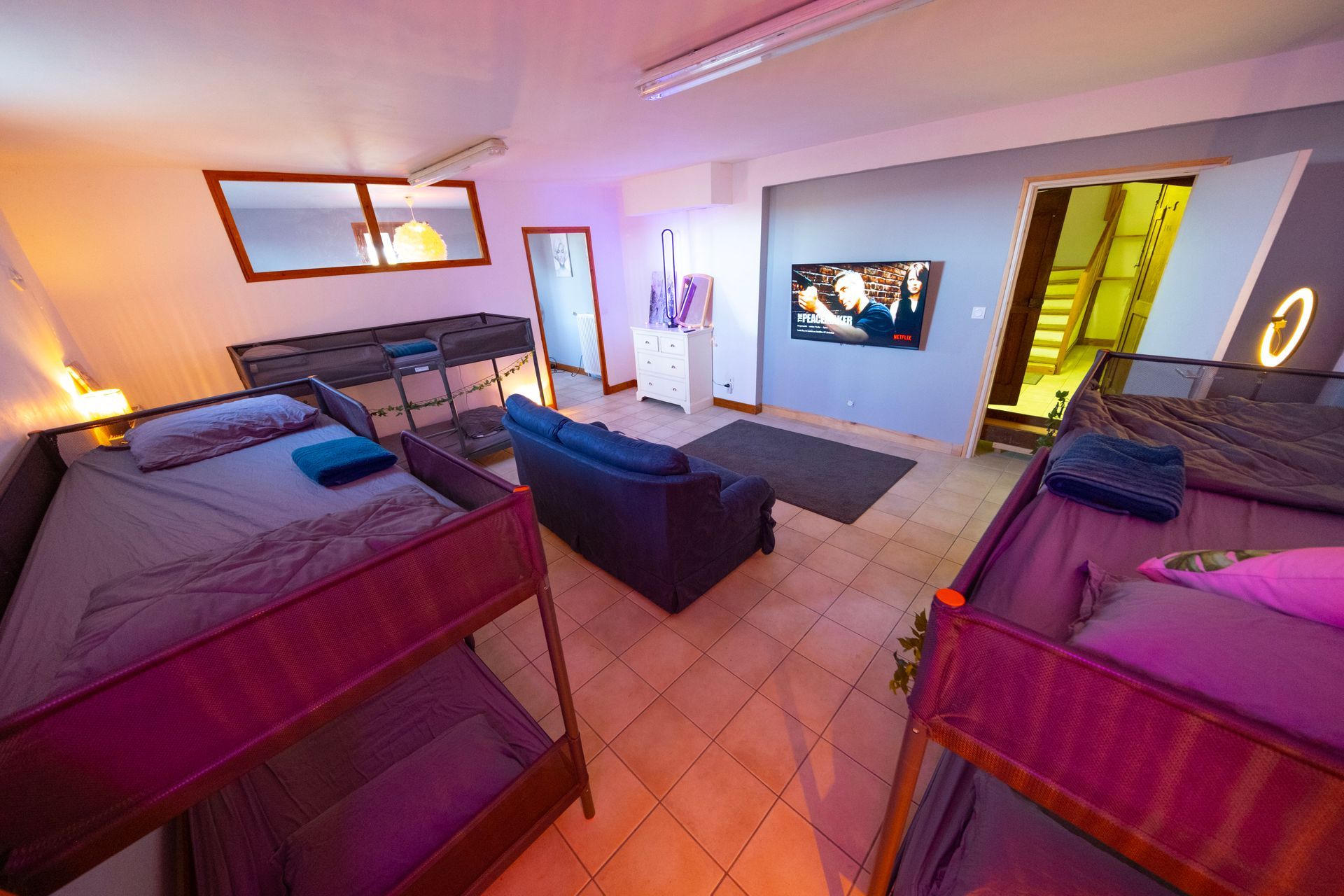 Slaapzaal op de benedenverdieping met stapelbedden voor maximaal zes kinderen en een aparte tweepersoonskamer met een tweepersoonsbed. De slaapzaal beschikt over een tv en een bank.