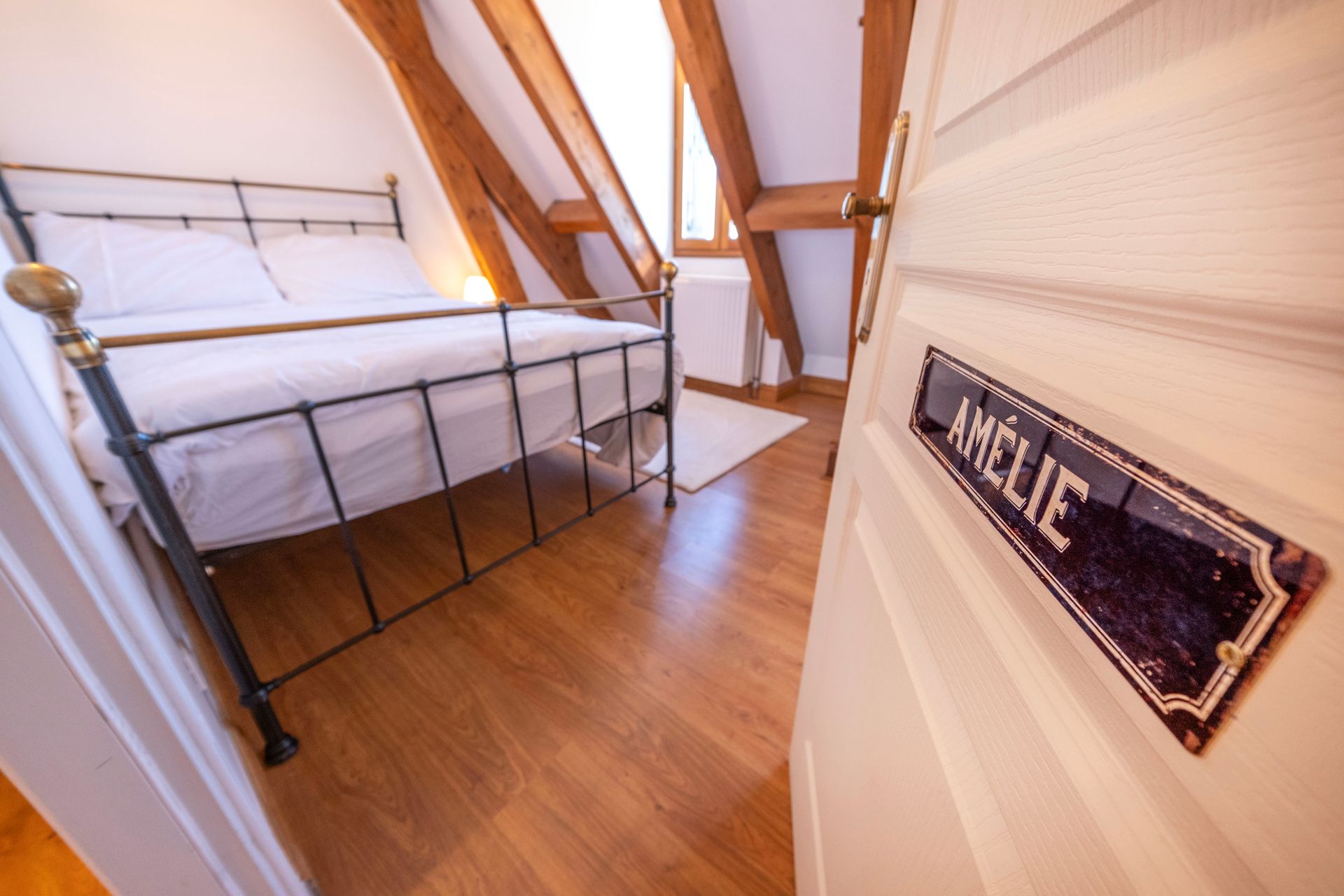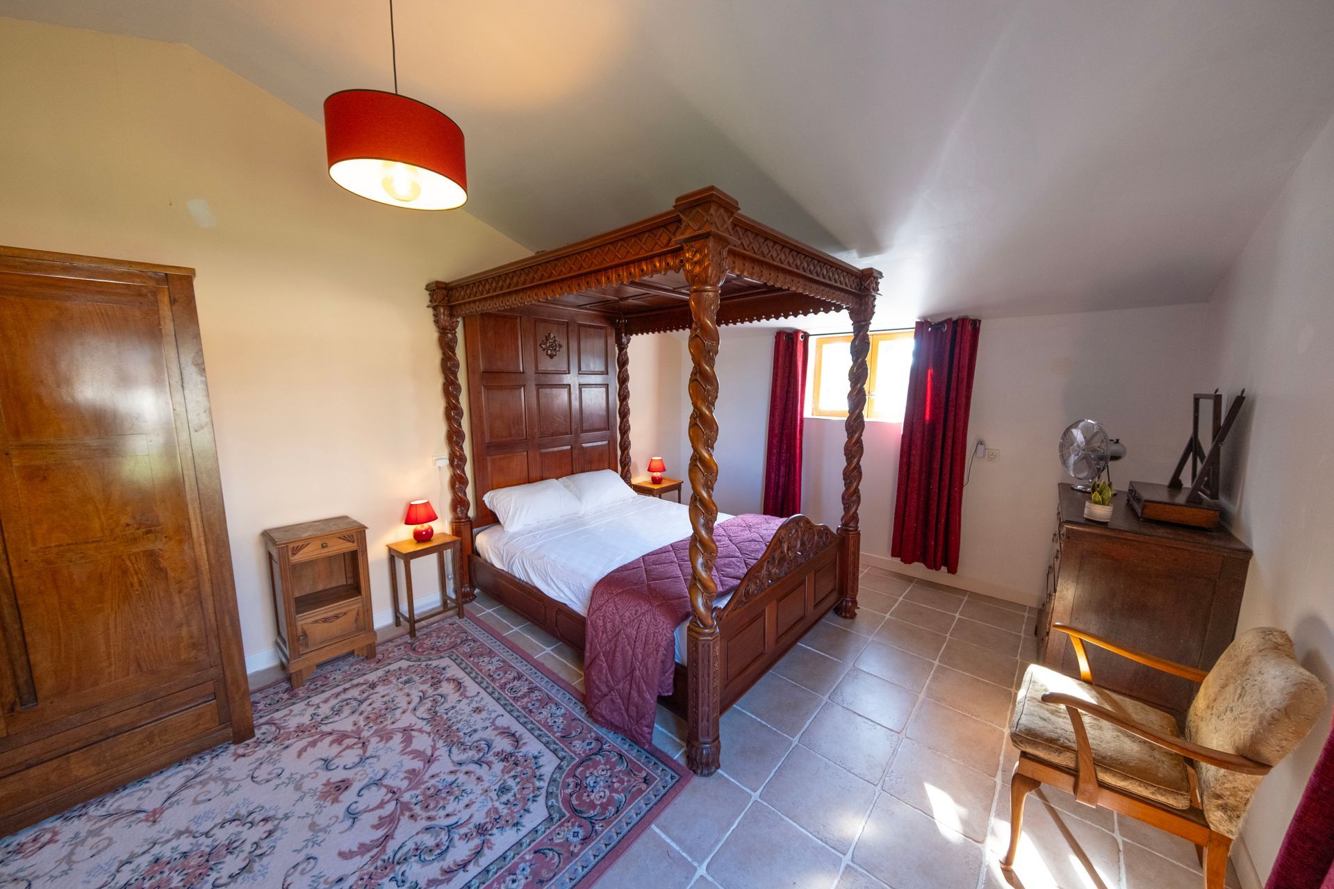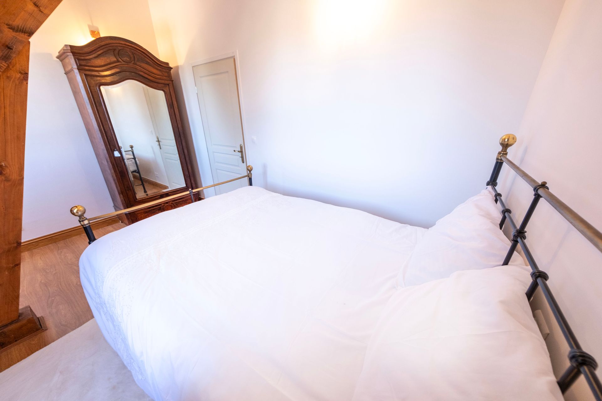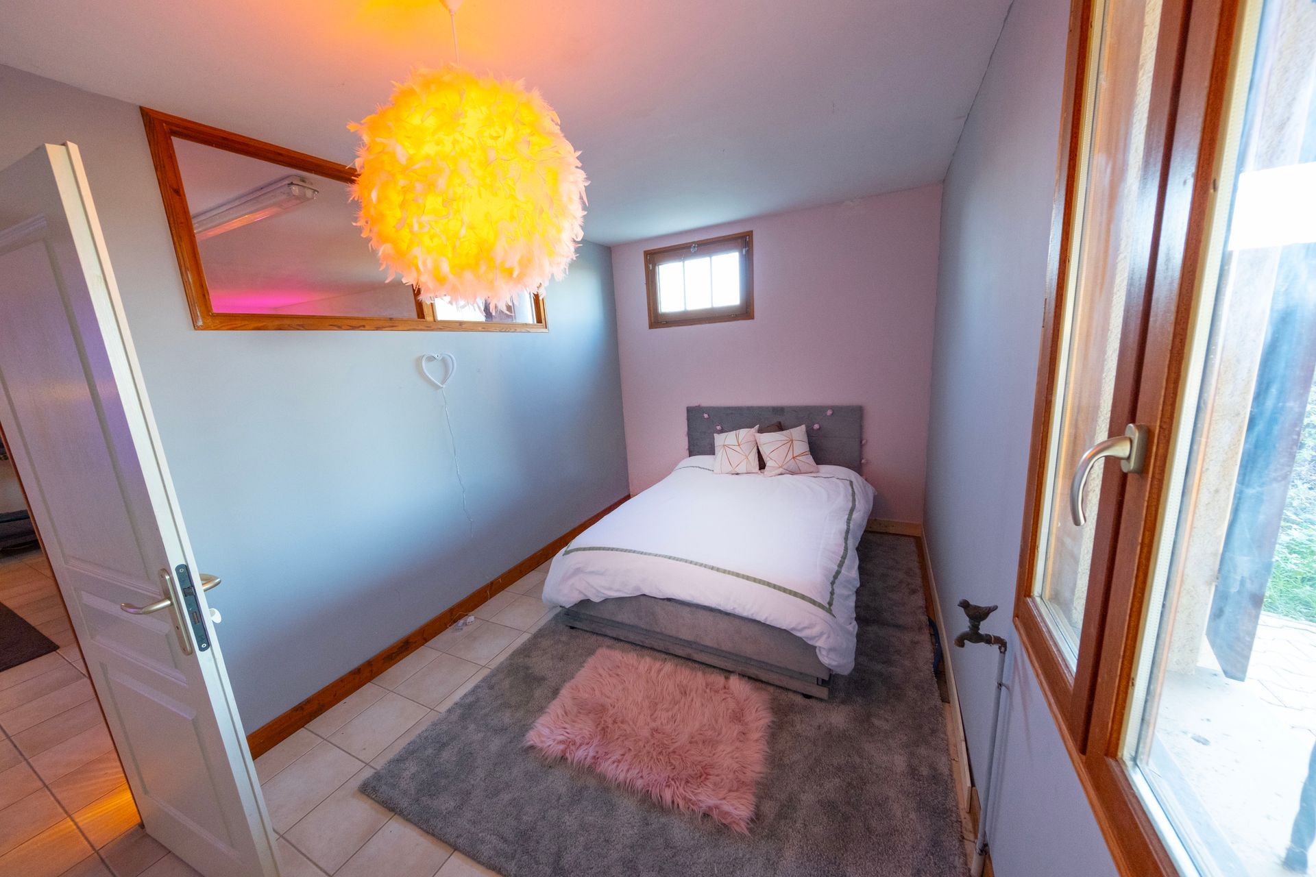 Slaapzaal op de benedenverdieping met stapelbedden voor maximaal zes kinderen en een aparte tweepersoonskamer met een tweepersoonsbed. De slaapzaal beschikt over een tv en een bank.