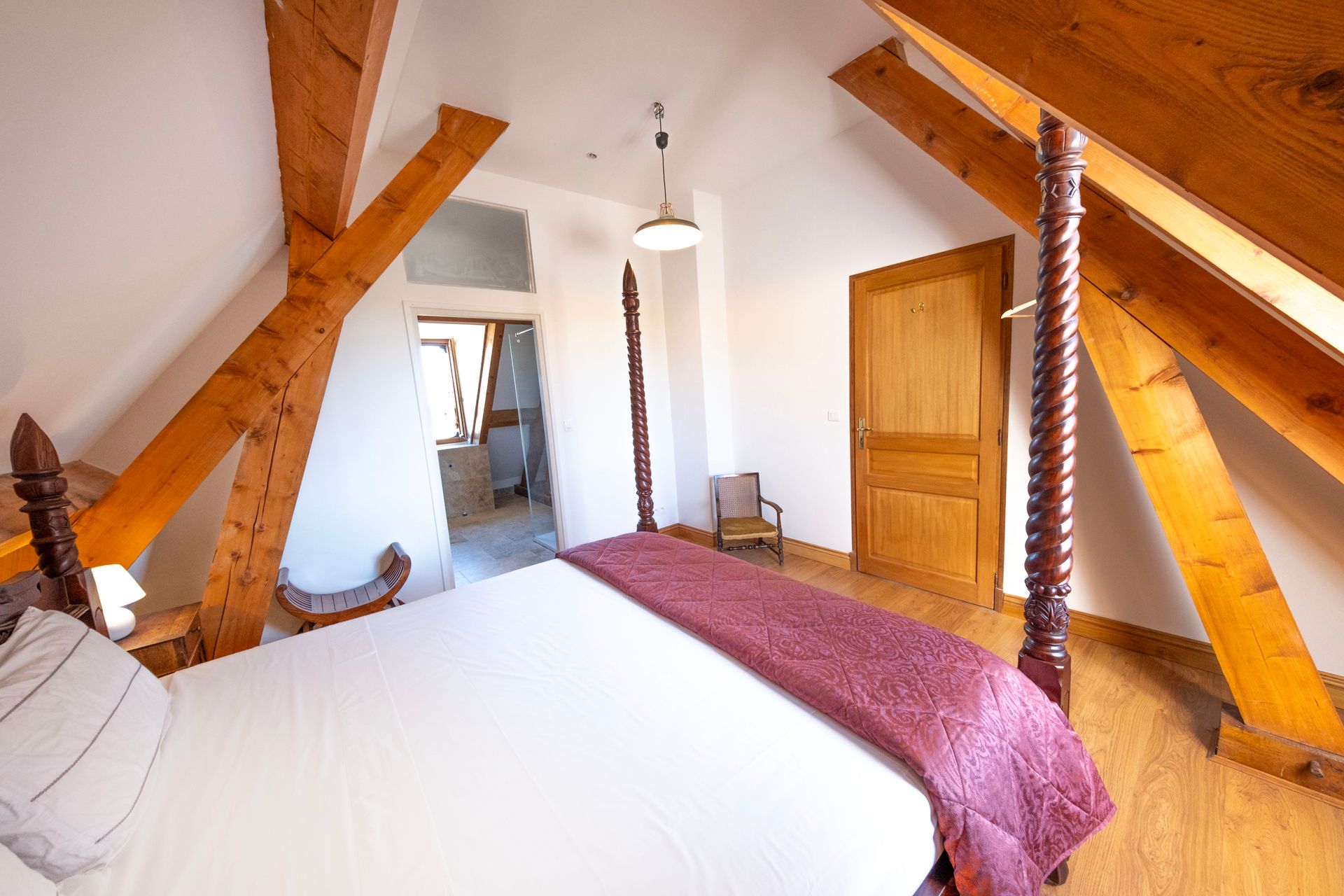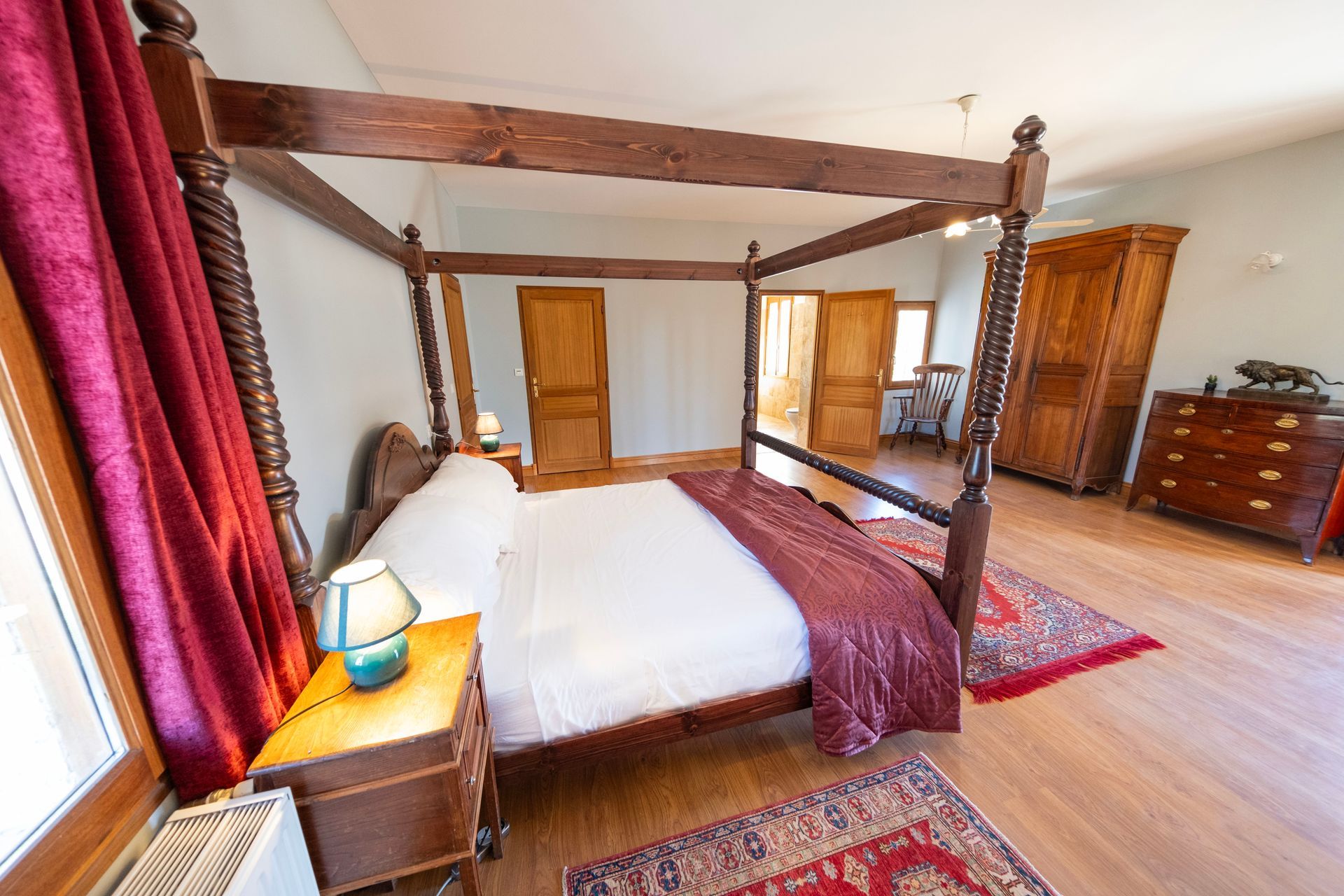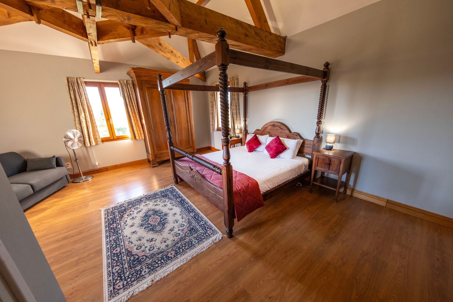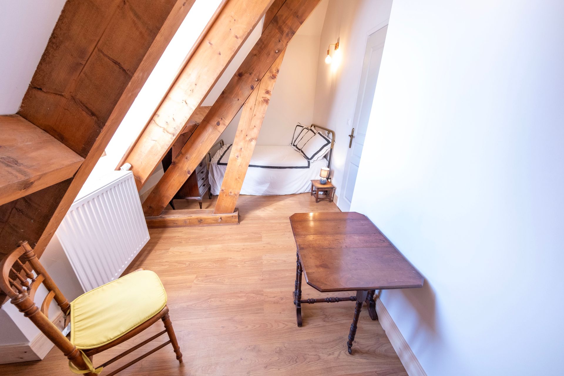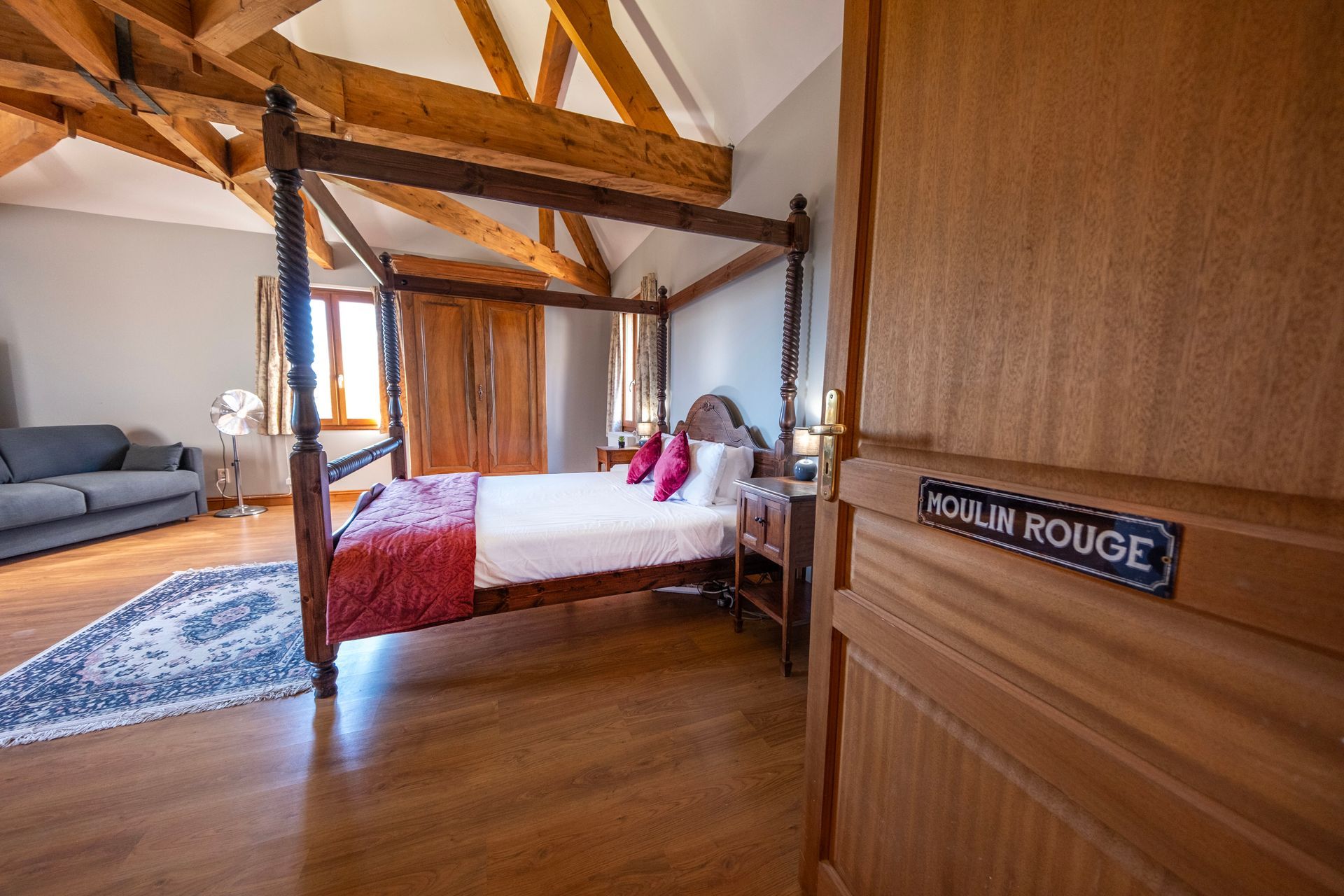 Slaapzaal op de benedenverdieping met stapelbedden voor maximaal zes kinderen en een aparte tweepersoonskamer met een tweepersoonsbed. De slaapzaal beschikt over een tv en een bank.