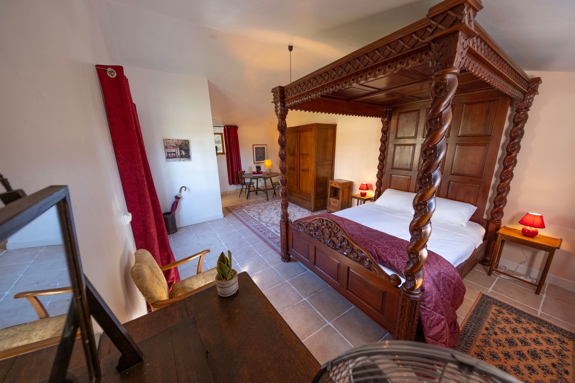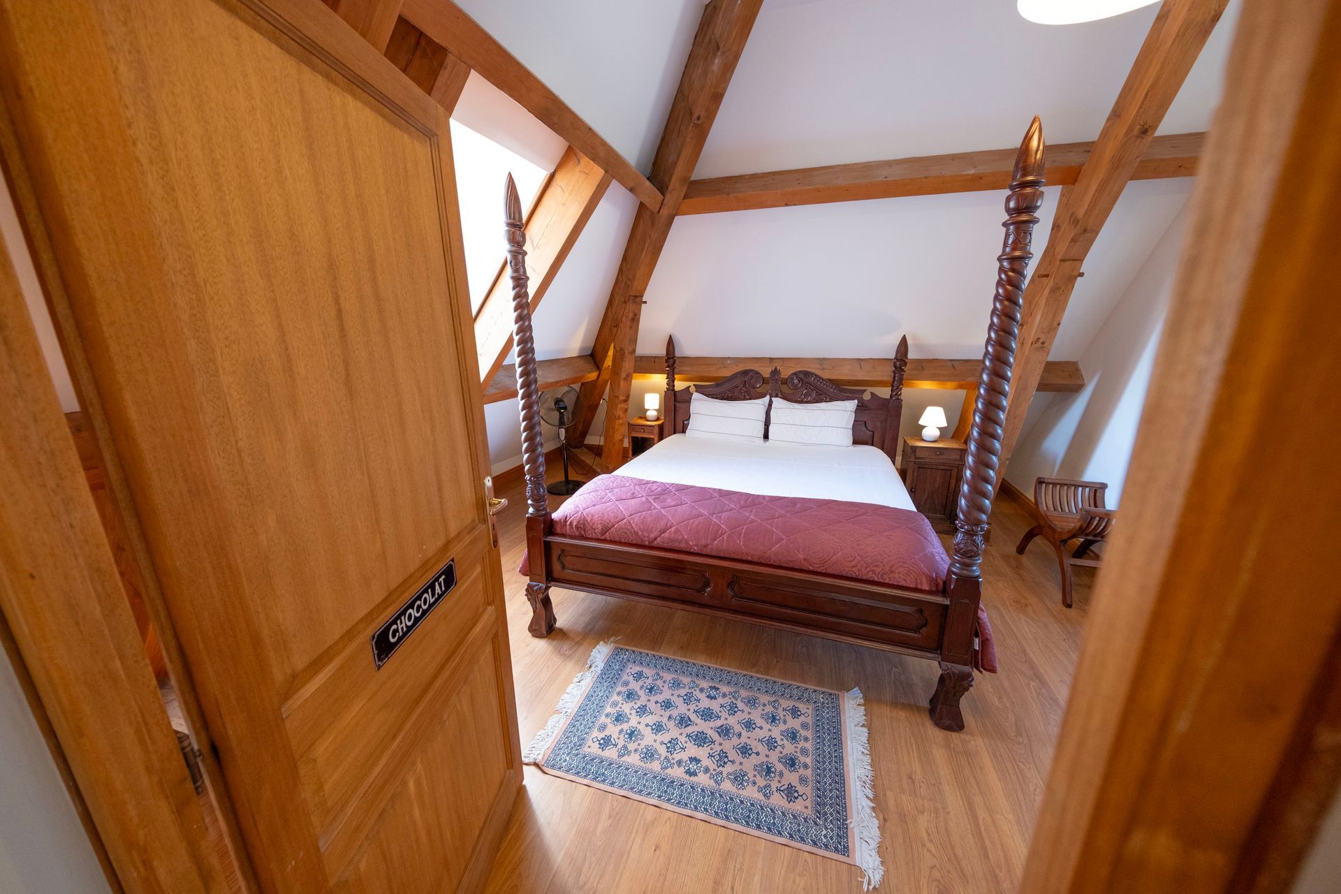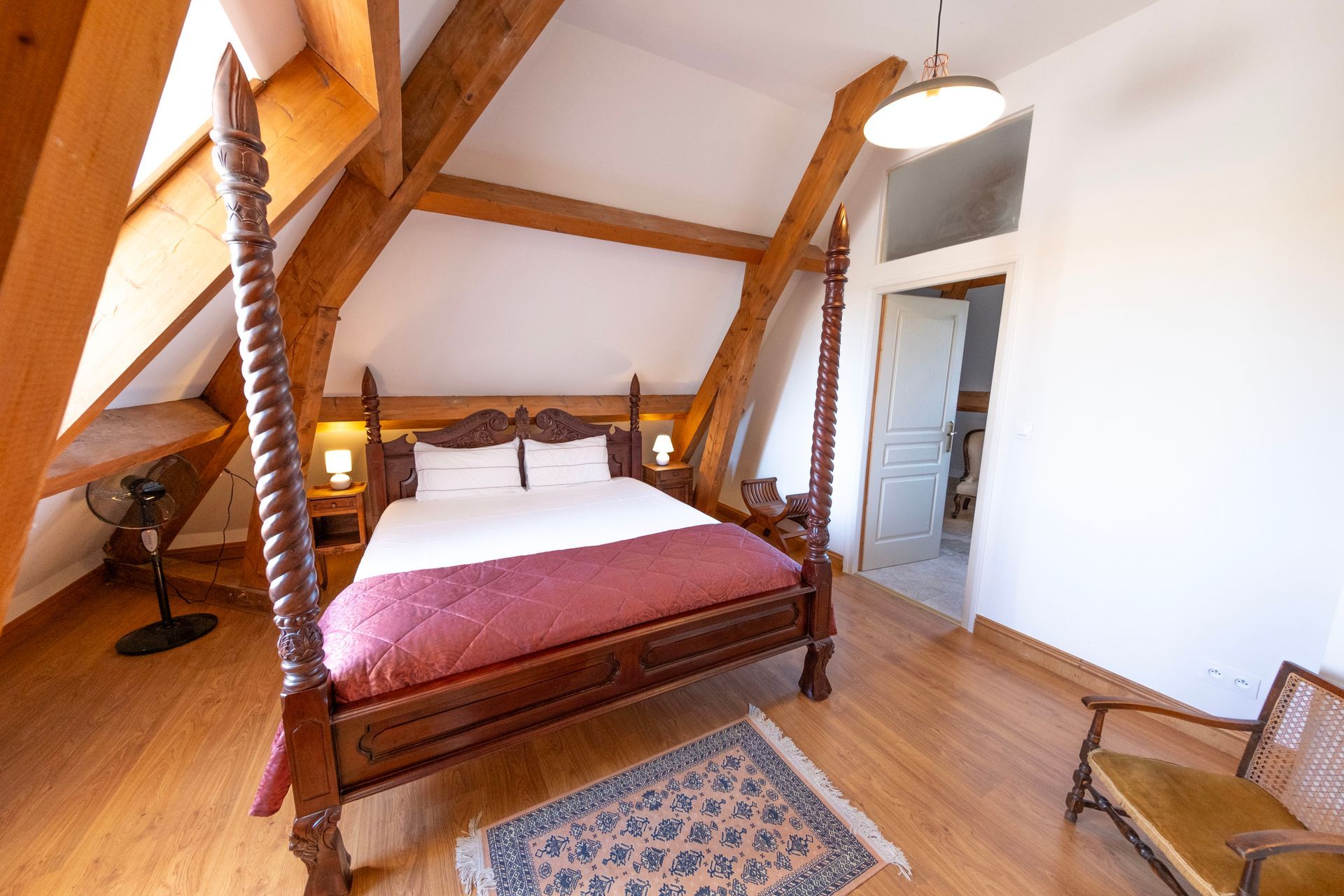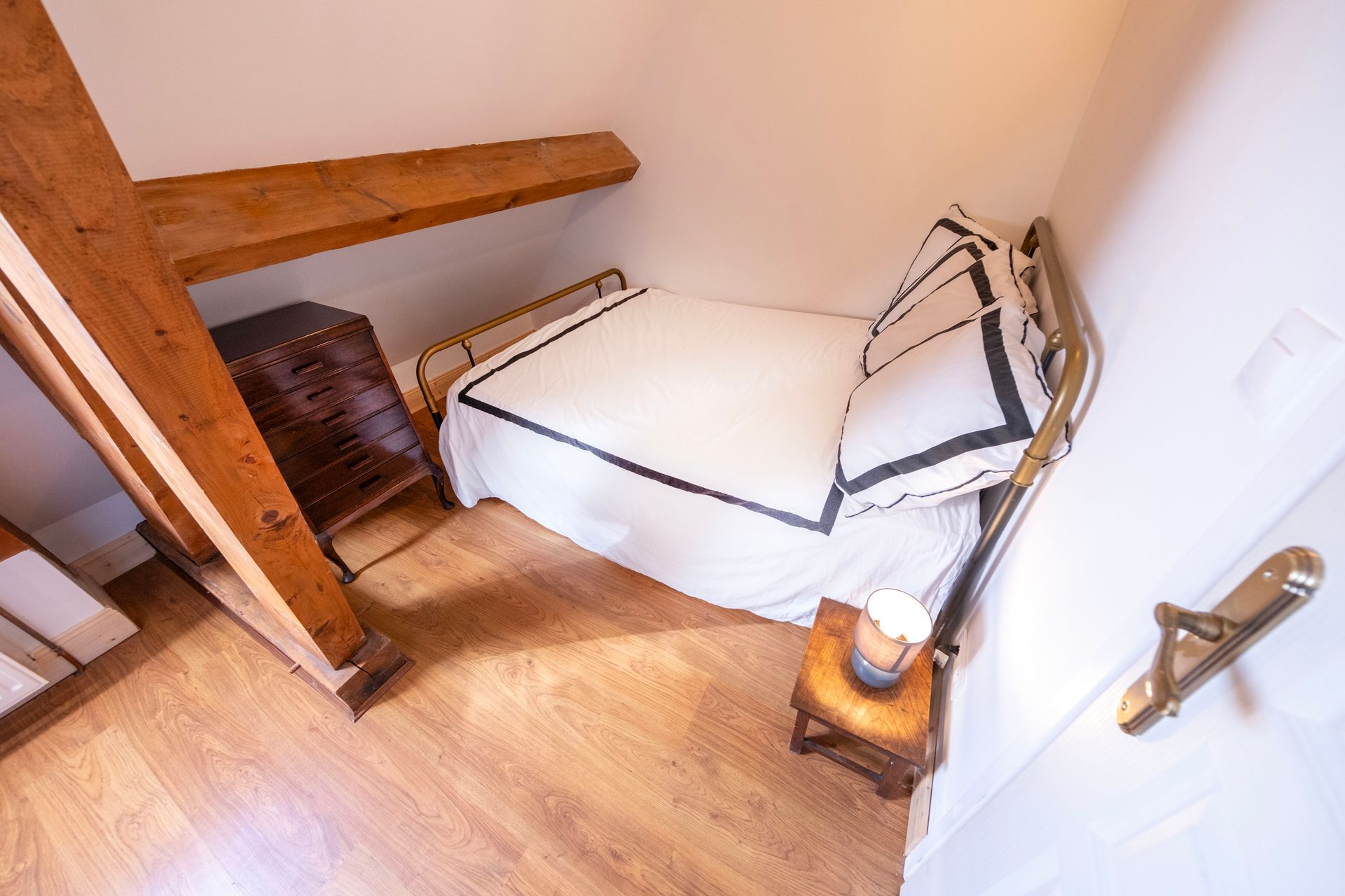 Slaapzaal op de benedenverdieping met stapelbedden voor maximaal zes kinderen en een aparte tweepersoonskamer met een tweepersoonsbed. De slaapzaal beschikt over een tv en een bank.